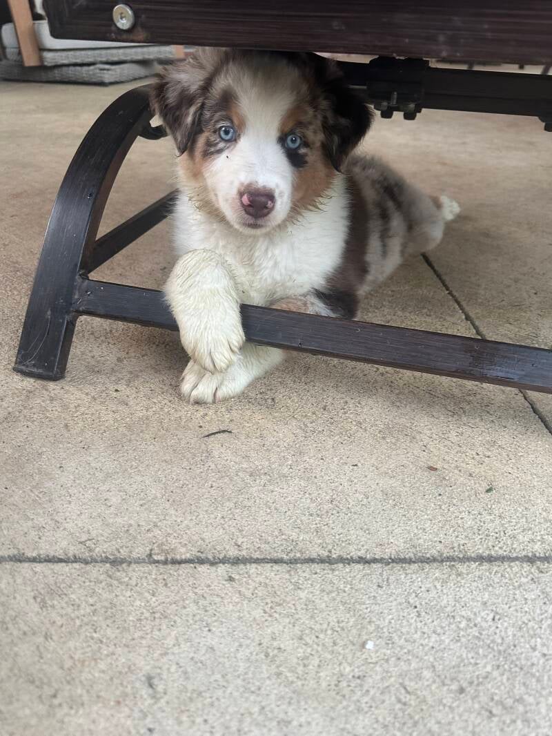 Ella possesses stunning Red Merle coat and captivating blue eyes. As she matures, she is expected to be on the larger end of the Australian Shepherd size spectrum, embodying the breed's robust and beautiful characteristics.